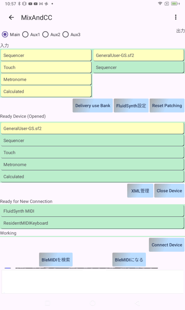そのうえで、他のアプリからのMIDI出力を”MIXandCC MIDI Main IN”とすると、別のアプリからMIXandCCあてに送られたMIDIが、サウンドフォントシンセサイザーとつながります。Mainのほか、Aux1~3もあります。