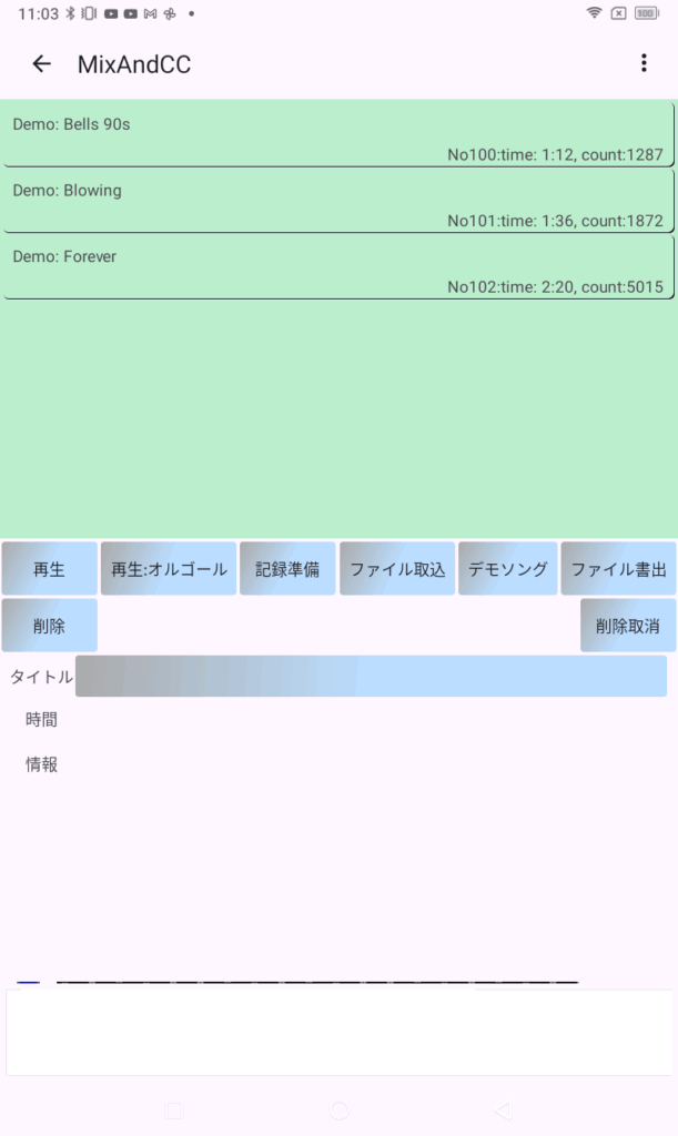 スロットを選択して、再生を選ぶと、再生されます。(後述のピアノロール)。デモソングをタップすると、デモソングが3曲一覧に追加されます。テストにご活用ください。